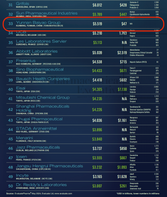 2024年6月15日,美国《制药经理人》杂志(PharmExec)发布了2024年全球制药企业TOP50榜单(以下简称“该榜单”),云南白药以近年来的最好成绩(第33名)再次跻身该榜单,且为该榜单全球制药50强阵营中排名最为靠前的中国制药企业。截至目前,云南白药已三次入围该榜单并均取得中国区最好排名。