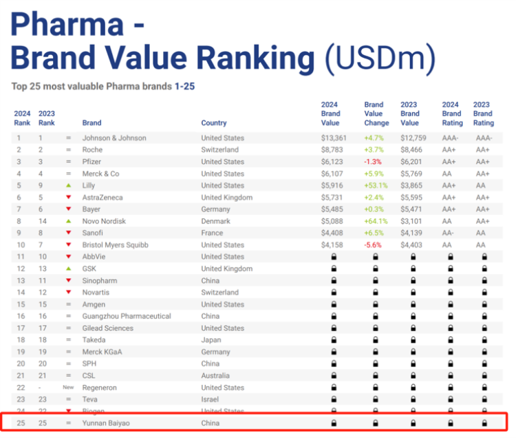 近日,国际权威品牌价值咨询公司Brand Finance正式发布《BrandFinance2024年度医疗保健——全球最具价值与最强医药、医疗器械及医疗服务品牌价值排行榜》,榜单显示,云南白药入围全球最具价值医药品牌25强,这也是云南白药自2021年以来连续第四次入围该榜单。