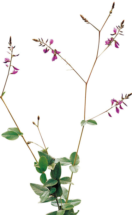 小灌木,高约1m,全株被锈色硬毛。根直,粗壮,有分枝,常有锈色油点,表面暗棕色,断面浅红色。茎直立,枝有棱。三出复叶互生;顶生小叶革质,卵圆形,先端钝圆或微凹,基部宽楔形,浅心形或近平截,两面有伏贴硬毛;侧生小叶较小或与顶生小叶几相等。总状花序腋生或聚成顶生的圆锥花序,有花十余朵;蝶形花冠紫红色,旗瓣椭圆形,龙骨瓣短于旗瓣而与翼瓣近等长,上部弯曲。荚果斜卵形,仅一荚节,被贴身长柔毛,紫色网脉明显。种子长圆形。花期夏、秋季。