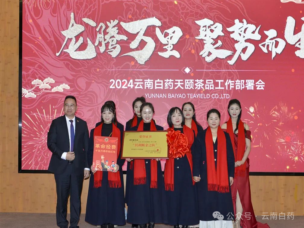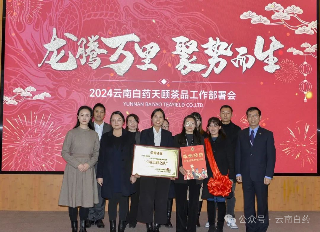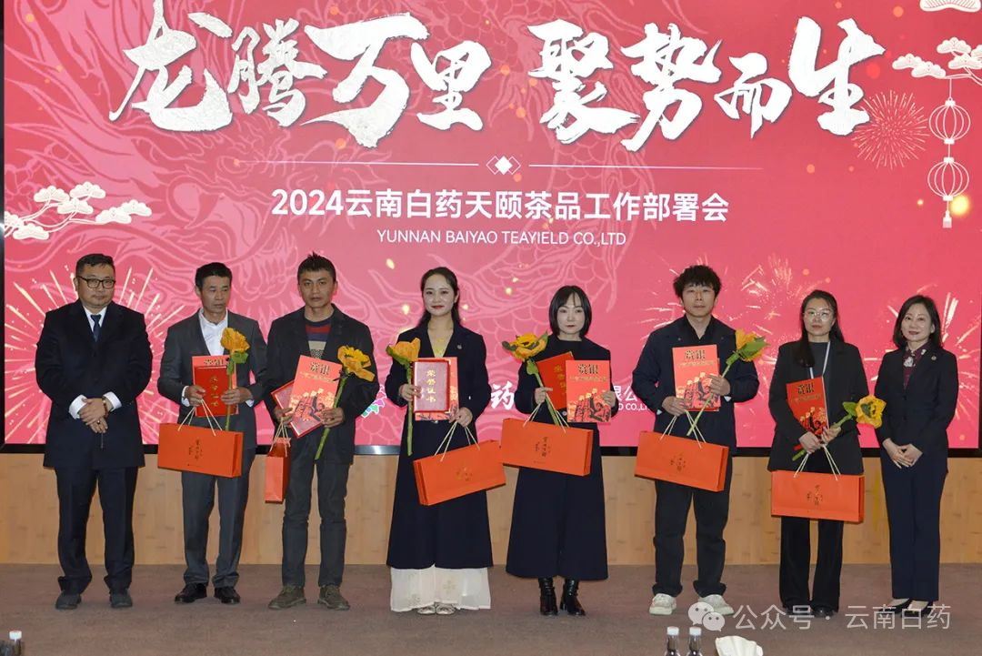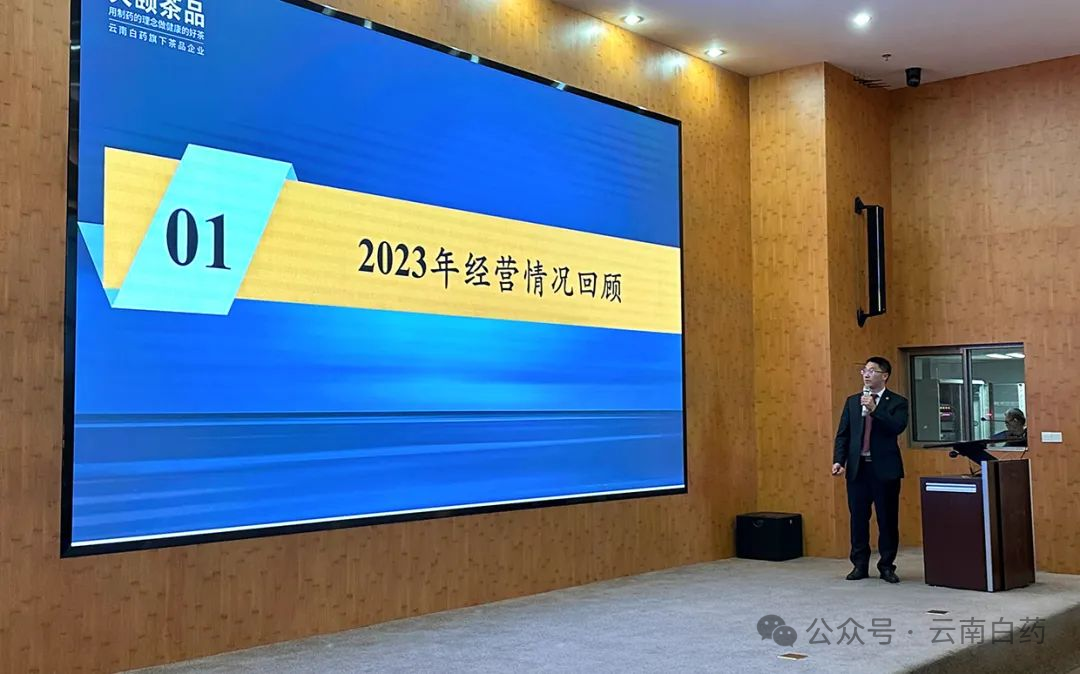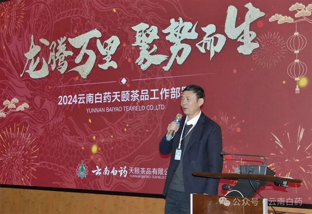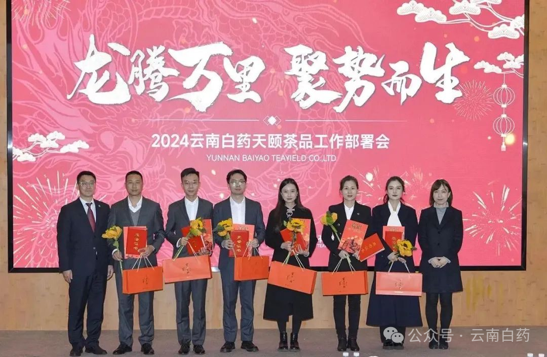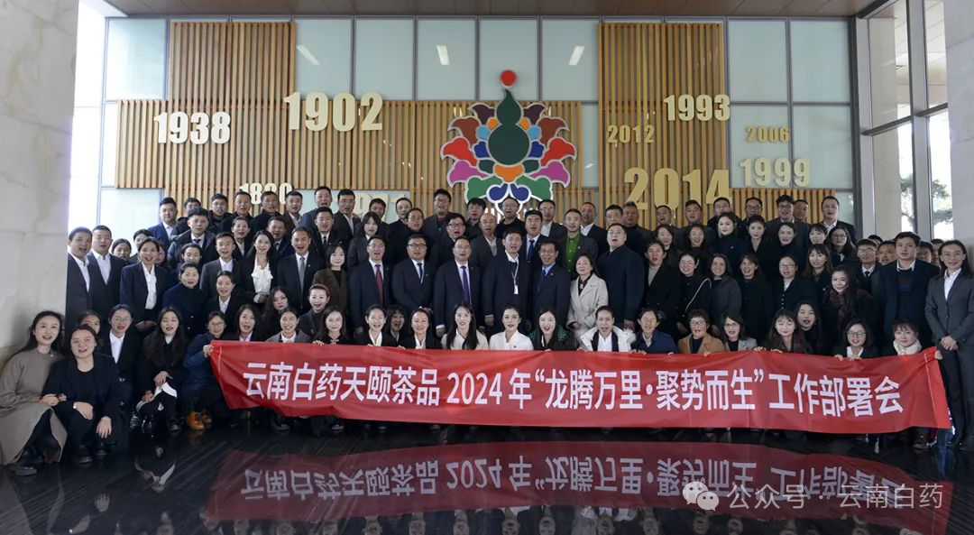 2024年1月24日,云南白药天颐茶品有限公司(以下简称天颐茶品)在云南白药集团总部召开“龙腾万里 聚势而生”工作部署会。云南白药集团首席创新官、高级副总裁秦皖民代表集团领导出席会议并作工作指示,云南白药天颐茶品有限公司执行董事、总经理黄卫东,阮朝帅副总经理,马敏总监,杨秀彬总监,付皜总监等相关领导出席会议。天颐茶品各营销区域负责人及骨干人员、中后台、子公司负责人及骨干人员共120人参加了会议。