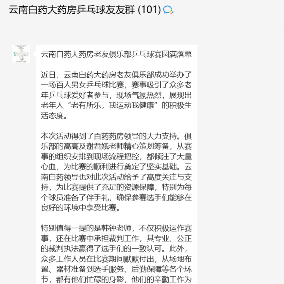 近日,云南白药大药房收到了来自参与了老友俱乐部第四期活动的“球友”的温暖来信:“云南白药大药房老友俱乐部成功举办了一场百人男女乒乓球比赛,赛事吸引了众多老年乒乓球爱好者参与,现场气氛热烈,展现出老年人‘老有所乐,我运动我健康’的积极生活态度……”