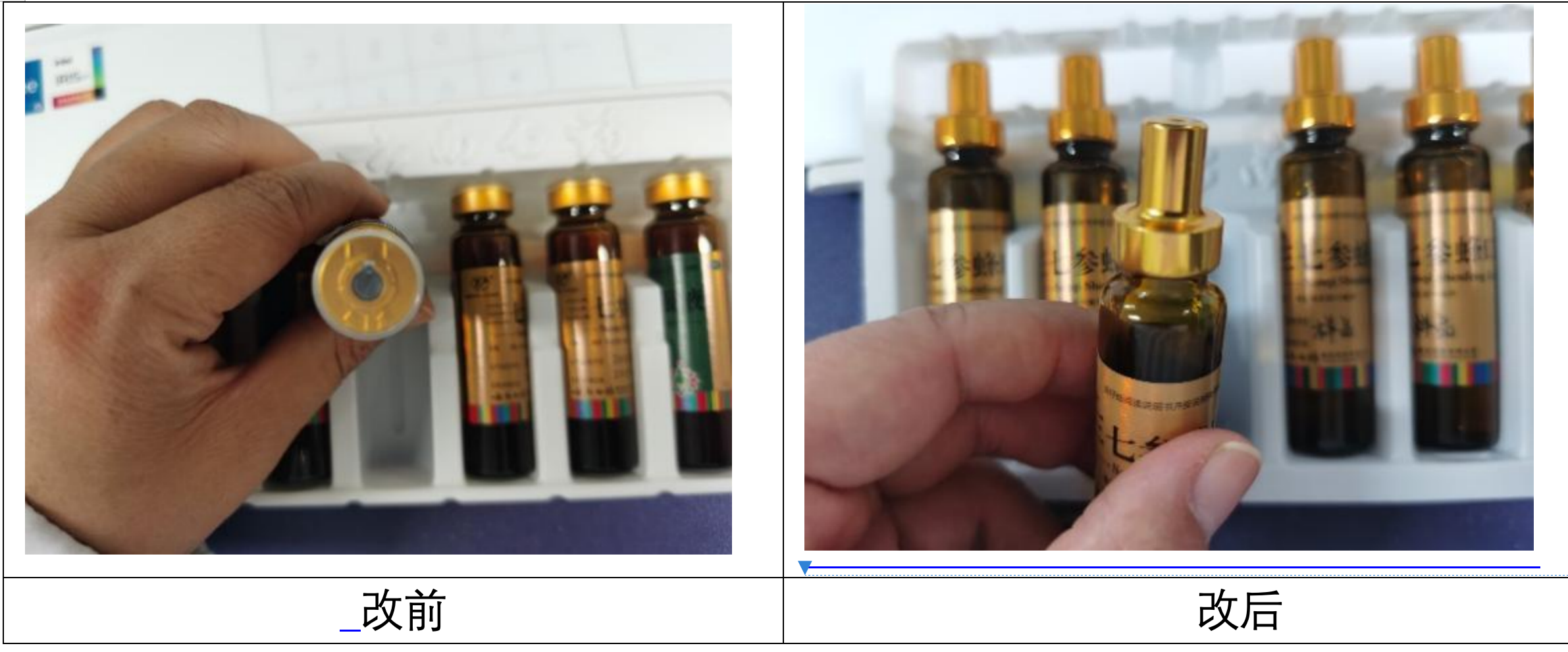 经过多轮测试和实验,项目组将原来口服液产品的铝塑组合盖改为易刺铝盖,可用吸管戳开,也可用手直接掰开,操作方便。因易刺铝盖颜色为金黄色,形状像山顶,故而起名“小金顶”。