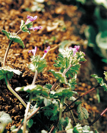 一年生或二年生草本。茎高10~30cm,基部分枝,四棱形,几无毛。叶圆形或肾形,先端浑圆,基部截形或截状阔楔形,边缘具深圆齿,两面疏生小糙伏毛;上部叶无柄而半抱茎。轮伞花序,6~10花;花冠紫红色或粉红色,被微柔毛,上唇直伸,长圆形;下唇稍长,3裂,中裂片倒心形,侧裂片浅圆裂片状。小坚果倒卵圆形,具三棱,深灰黄色,有白色大疣状突起。花期3~5月,果期7~8月。