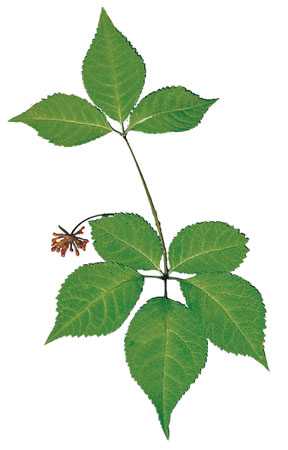 多年生草本,高50~80(~100)cm。根茎横卧,呈串珠状,节间细长如绳,有时部分结节密生呈竹鞭状。掌状复叶3~5枚轮生于茎端;叶柄长8~11cm;小叶卵状椭圆形至椭圆形,不裂,上面沿脉疏被刚毛,先端渐尖,基部楔形至圆形。伞形花序单生于茎端,有花50~80朵或更多;花小,淡绿色;花萼先端具 5尖齿;花瓣5,卵状三角形,先端尖;雄蕊5,花丝短;子房下位,花柱2,分离。核果状浆果,圆球形,熟时鲜红色。种子2~5粒,白色,三角状长卵形。花期5~6月,果期7~9月。