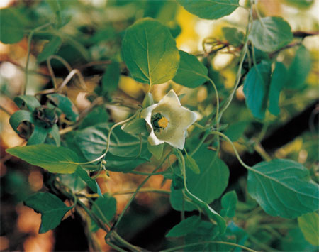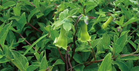 多年生草质藤本,有乳汁。根呈纺锤状圆柱形,肥大肉质,具多数瘤状的茎痕,外皮乳黄色至淡灰棕色,有纵横皱纹。茎缠绕,长而多分枝。叶在主茎及侧枝上的互生,在小枝上的近于对生;叶片卵形或窄卵形,先端钝或尖,基部截形或浅心形,全缘或微波状,上面绿色,被粗伏毛,下面灰绿色,被疏柔毛。花单生;花萼绿色,具5裂片;花冠广钟形,淡黄绿色,5浅裂,内面有紫斑。蒴果圆锥形。种子小,褐色有光泽。花期8~9月,果期9~10月。