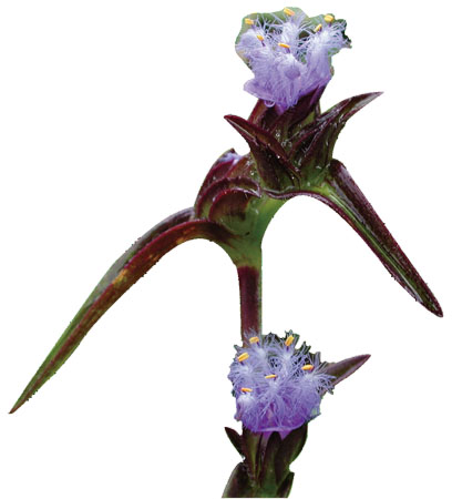 多年生草本,高15~30(~80)cm,有成丛的基生叶,从中发出数枝披散紫绿色的茎,全株被丝状白色绵毛。根数条,较粗,稍肉质。基生叶带状,长8~20cm,茎生叶互生,较短,长2~3cm,基部有明显的膜质叶鞘。聚伞花序顶生或腋生,复出而成头状,无柄或具短柄,为佛焰总苞所托,花有数朵;总苞片卵状披针形,苞片镰刀状弯曲;花瓣蓝紫色;萼片、花瓣各3片;雄蕊6,花丝长而上部扭曲,密生蓝紫色的毛;子房3室,顶端具疏毛。蒴果倒卵状三角形,顶端被毛。种子小,圆锥状卵形,稍有皱纹。