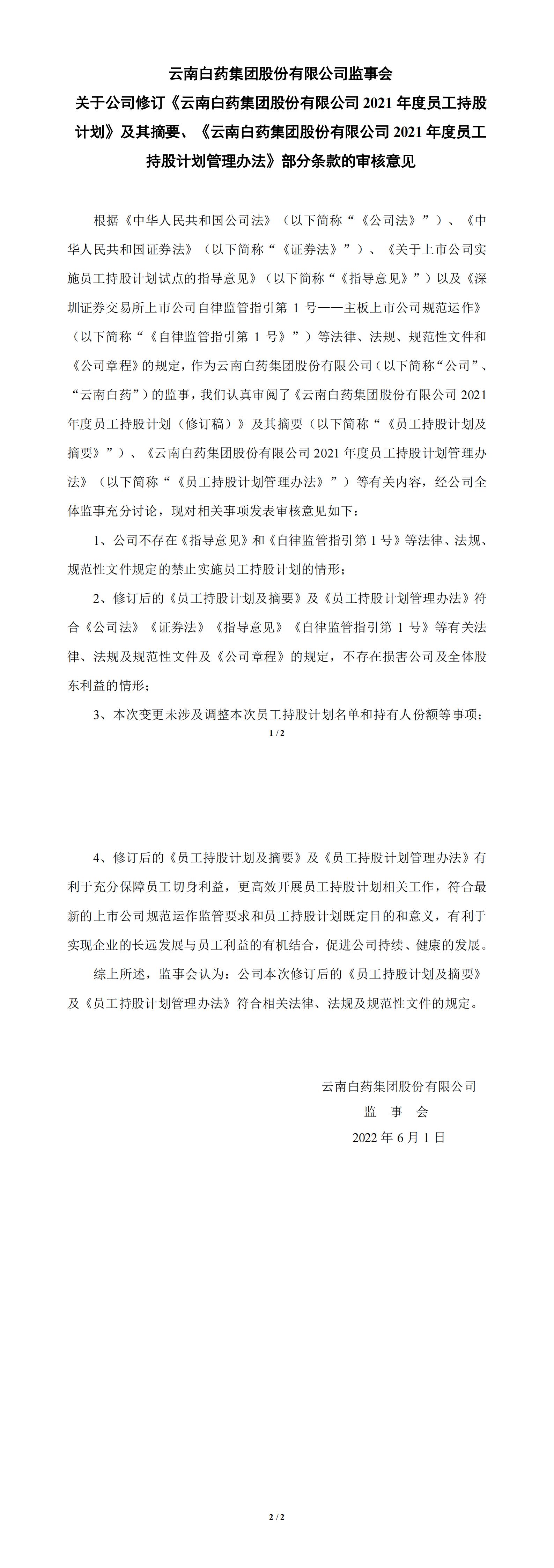云南白药监事会关于公司修订《云南白药集团股份有限公司2021年度员工持股计划》及其摘要、《云南白药集团股份有限公司2021年度员工持股计划管理办法》部分条款的审核意见