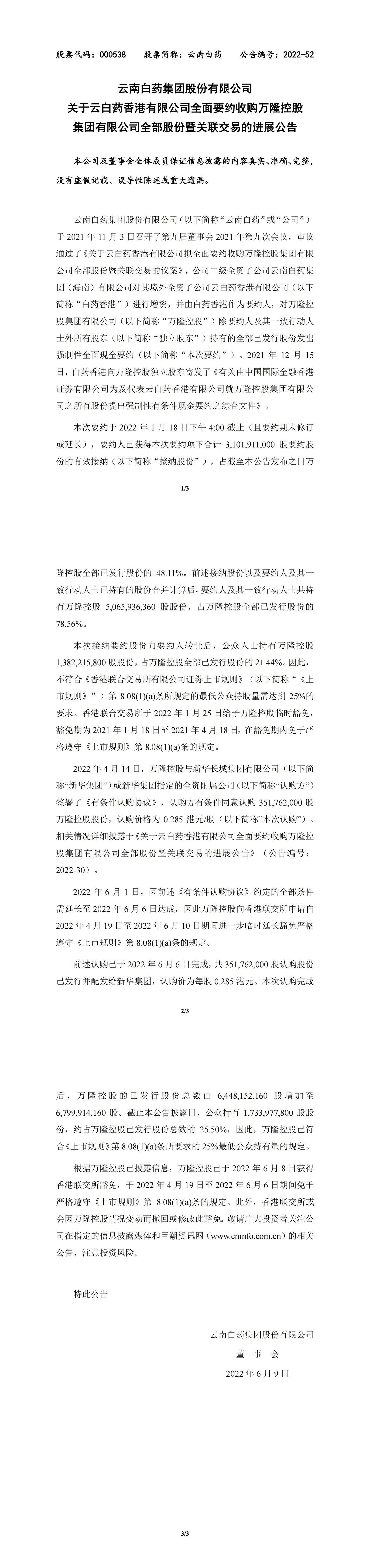 关于云白药香港有限公司全面要约收购万隆控股集团有限公司全部股份暨关联交易的进展公告