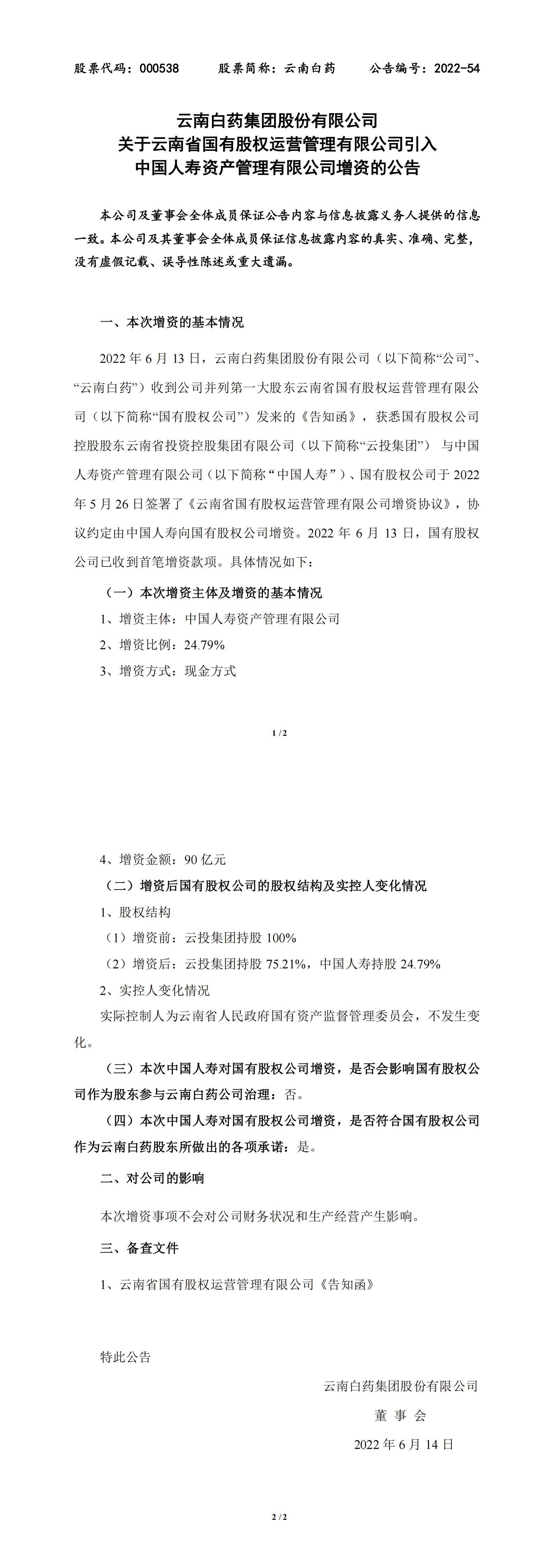 关于云南省国有股权运营管理有限公司引入中国人寿资产管理有限公司增资的公告