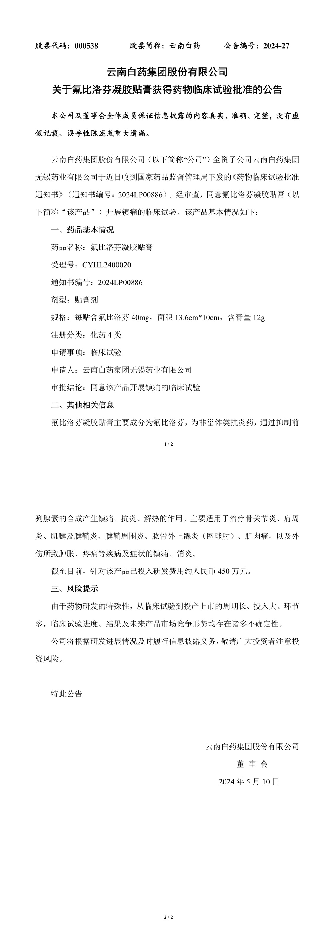 关于氟比洛芬凝胶贴膏获得药物临床试验批准的公告