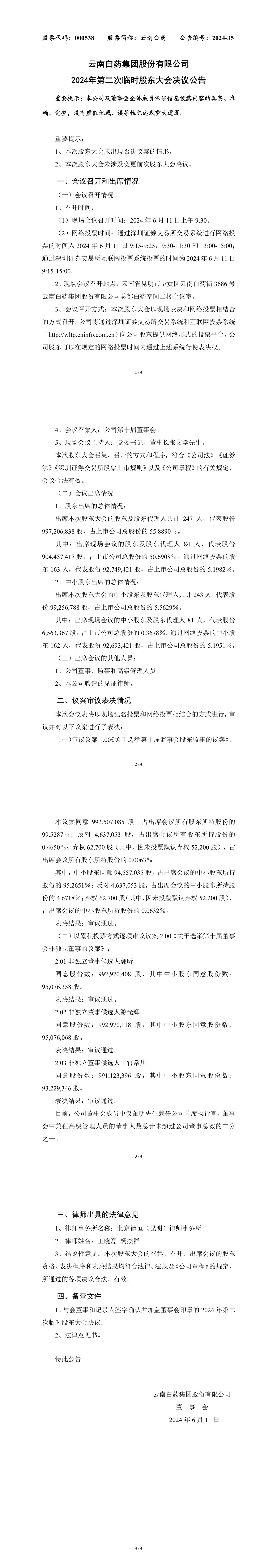 关于云南白药集团股份有限公司2024年第二次临时股东大会的法律意见