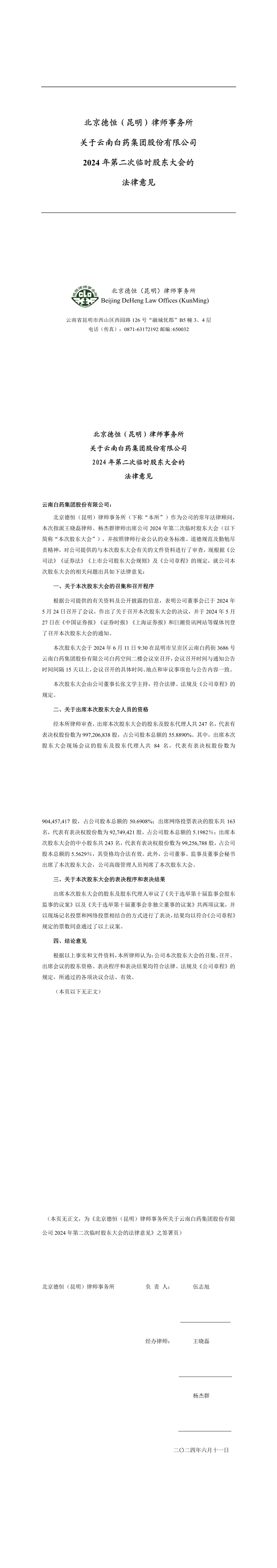 关于云南白药集团股份有限公司2024年第二次临时股东大会的法律意见