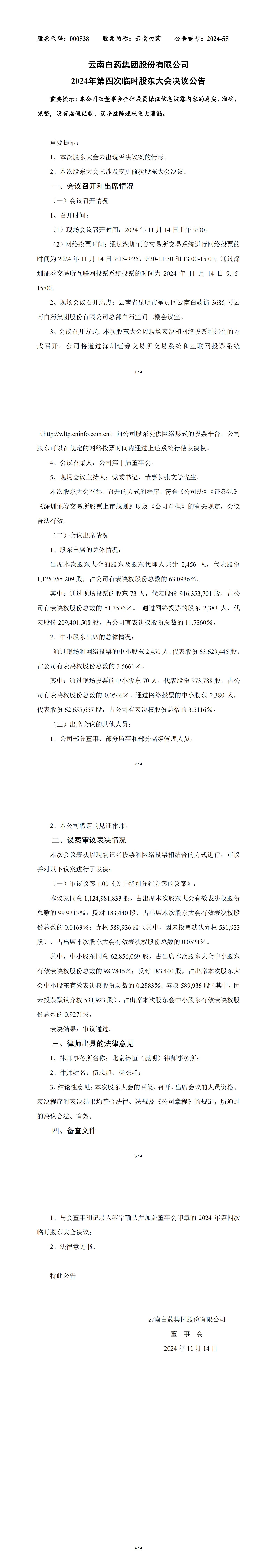关于云南白药集团股份有限公司2024年第四次临时股东大会的法律意见