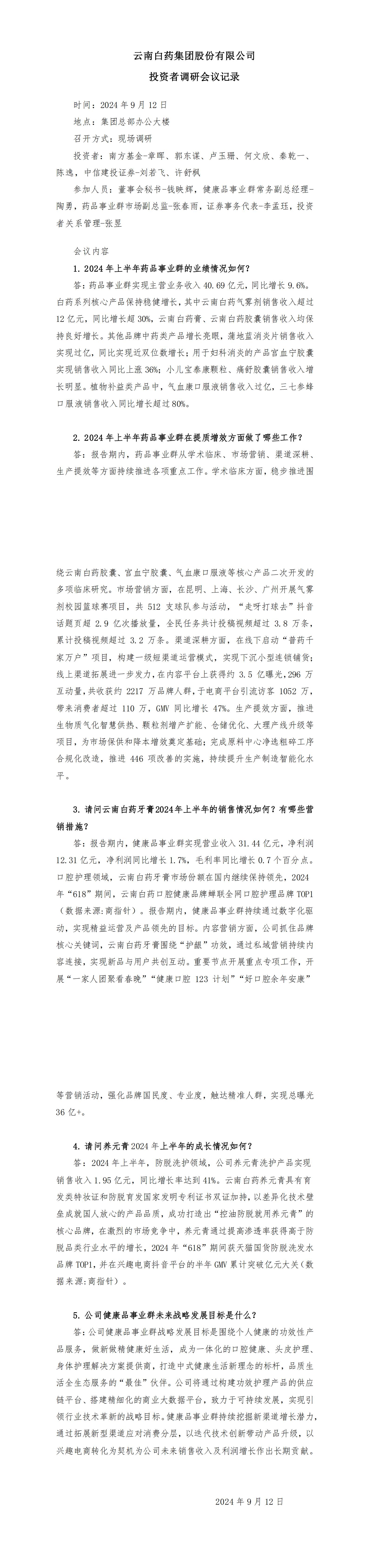 20240912投资者访谈:南方基金-章晖、郭东谋、卢玉珊、何文欣、秦乾一、 陈逸,中信建投证券-刘若飞、许舒枫