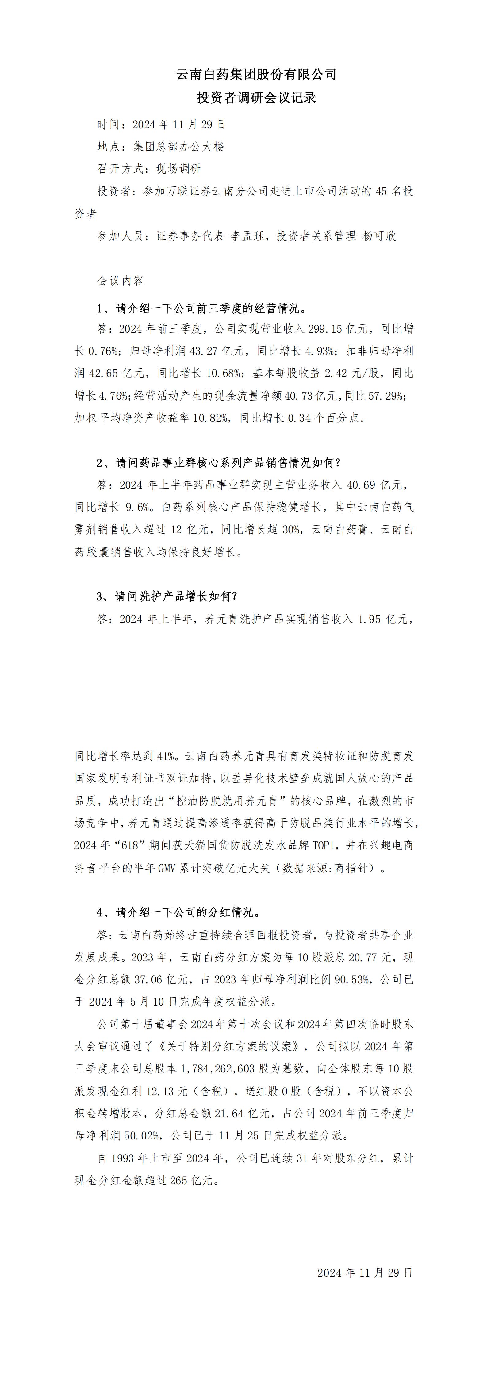 20241129投资者访谈:参加万联证券云南分公司走进上市公司活动的45名投资者