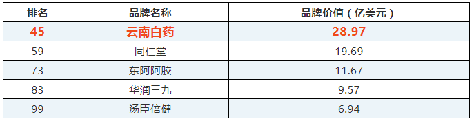 5月6日,WPP携手凯度共同发布了“BrandZ™2019 最具价值中国品牌100强”排行榜。云南白药以品牌价值28.97亿美元,位列榜单第45位,医疗保健行业第1位。