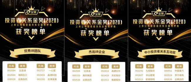 4月13日,由全景网主办的“中国上市公司全国性年度评选——全景投资者关系金奖”评选结果正式揭晓。云南白药获得“杰出IR企业、优秀IR团队、中小投资者关系互动奖”3项大奖。全景网是中国证监会及各地证监局,深、沪、港三大交易所、股转系统及各地金融局、高新区的长期合作伙伴,具有较高行业认可度及市场影响力。