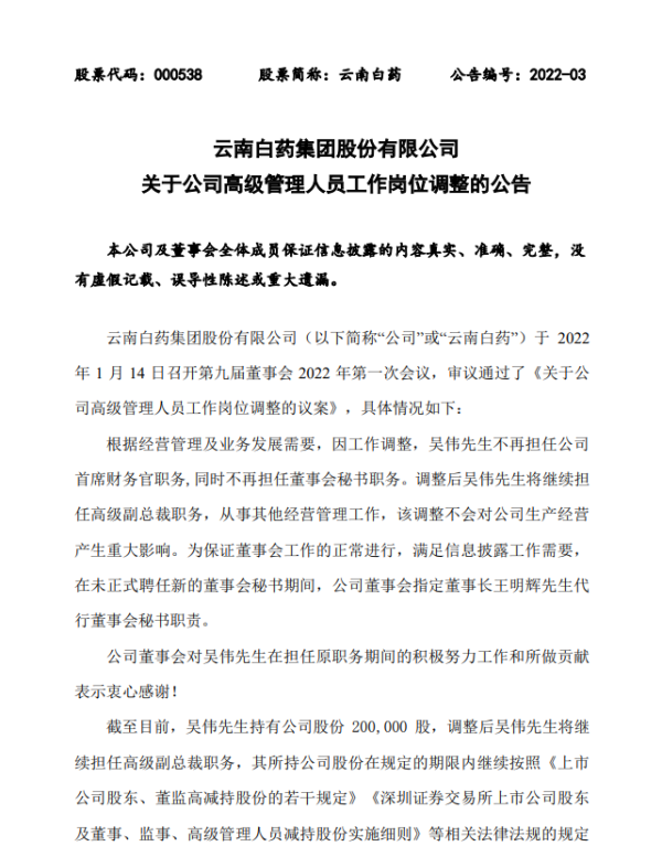 1月14日,公司发布公告,根据经营管理及业务发展需要,因工作调整,吴伟先生不再担任公司首席财务官职务,同时不再担任董事会秘书职务,将继续担任高级副总裁职务,从事其他经营管理工作,该调整不会对公司生产经营产生重大影响。