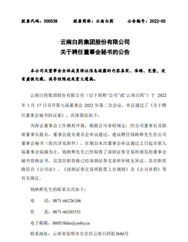 1月24日,集团第九届董事会2022年第3次会议审议通过了《关于聘任公司高级管理人员的议案》,聘任张宁教授为云南白药集团首席科学家。