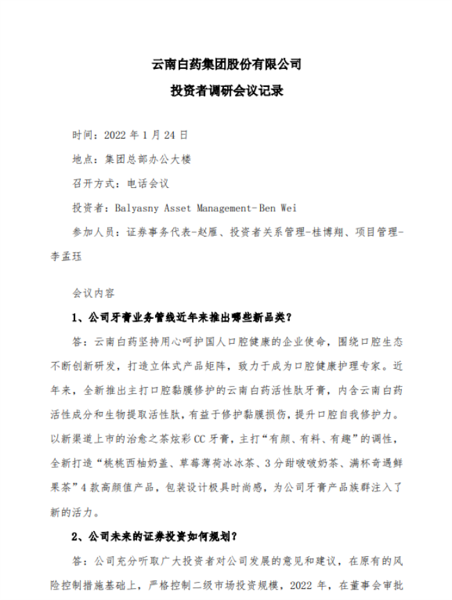 本月,云南白药共接受14场机构投资者调研(13场电话会议,1场实地调研),接待招商基金、易方达基金、人保养老、光大证券等机构的132位投资者,就研发、数字化转型、渠道、产品等问题进行了交流。