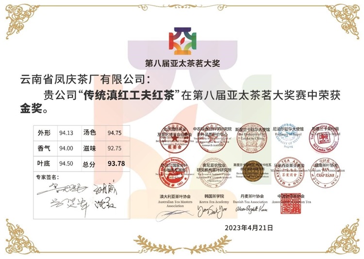 红瑞徕·传统滇红工夫红茶获第八届亚太茶茗大奖赛金奖
