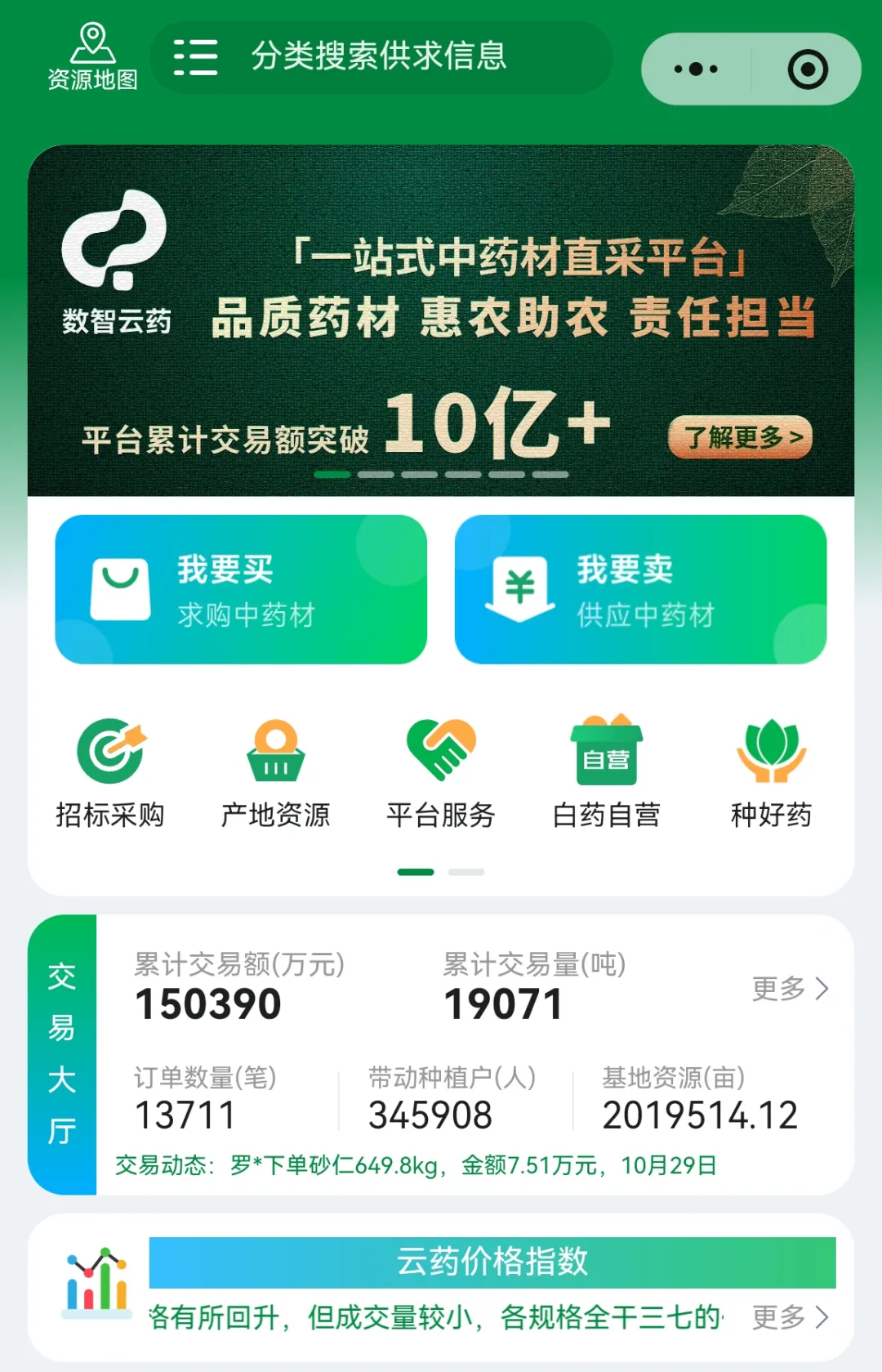 一手建基地,一手上云端。打开云南白药开发的“数智云药”小程序,各类交易信息实时更新、一目了然,点击“我要买”或“我要卖”,便能实现产品的云选、撮合、交易,仅屏边苗族自治县的注册用户便已超过7000人。