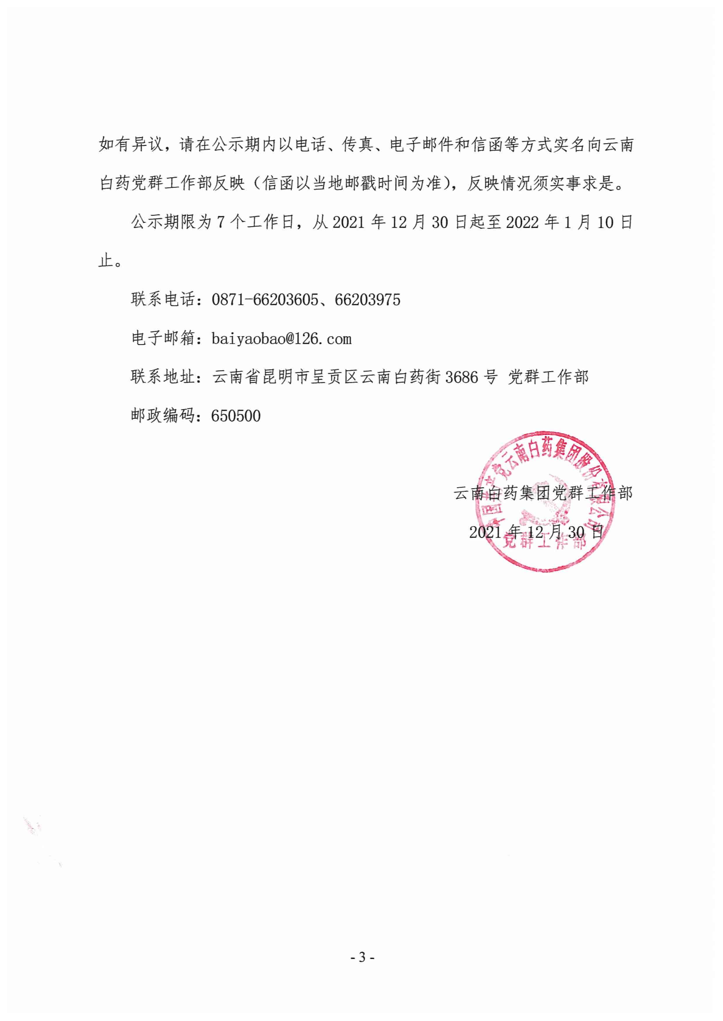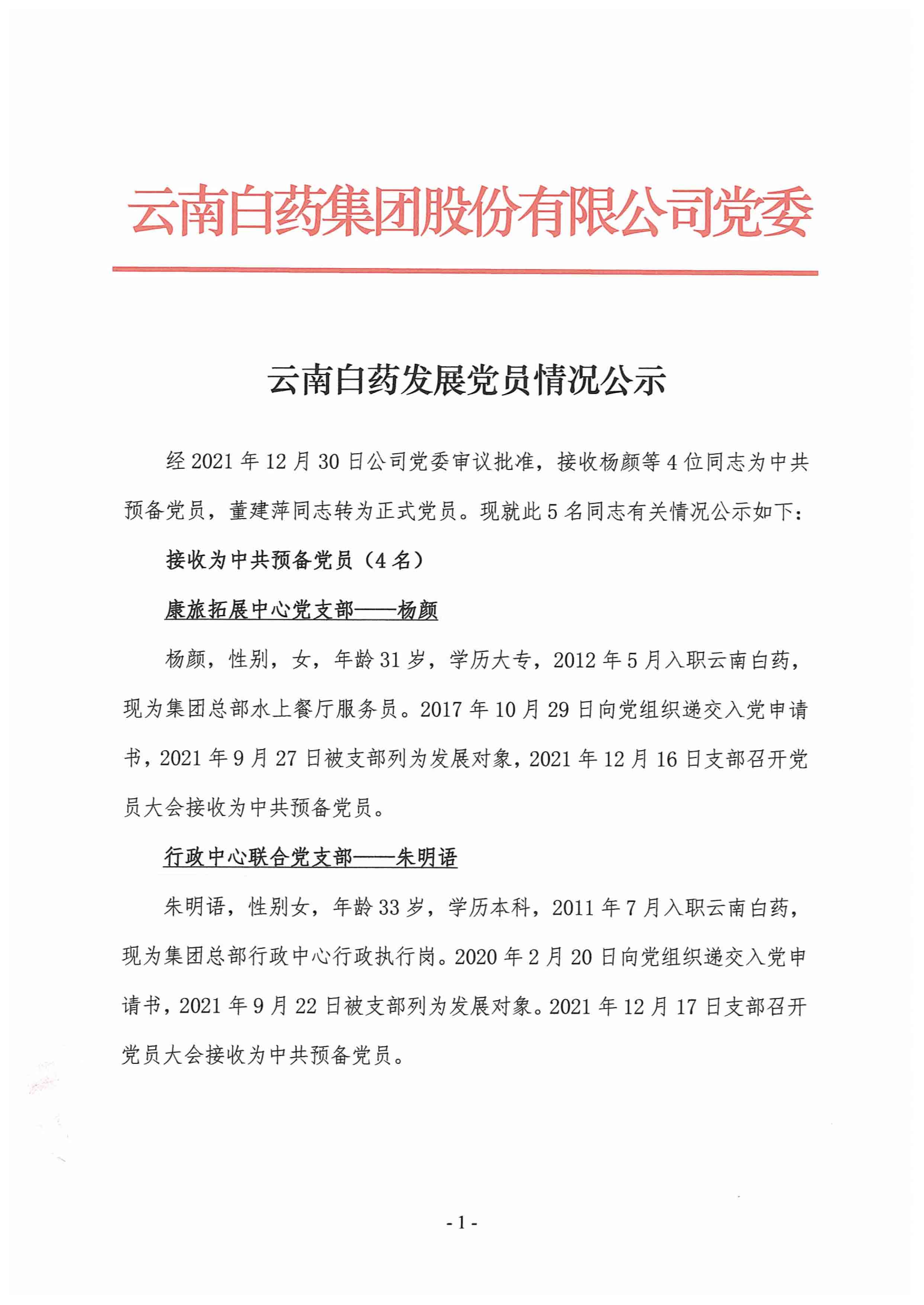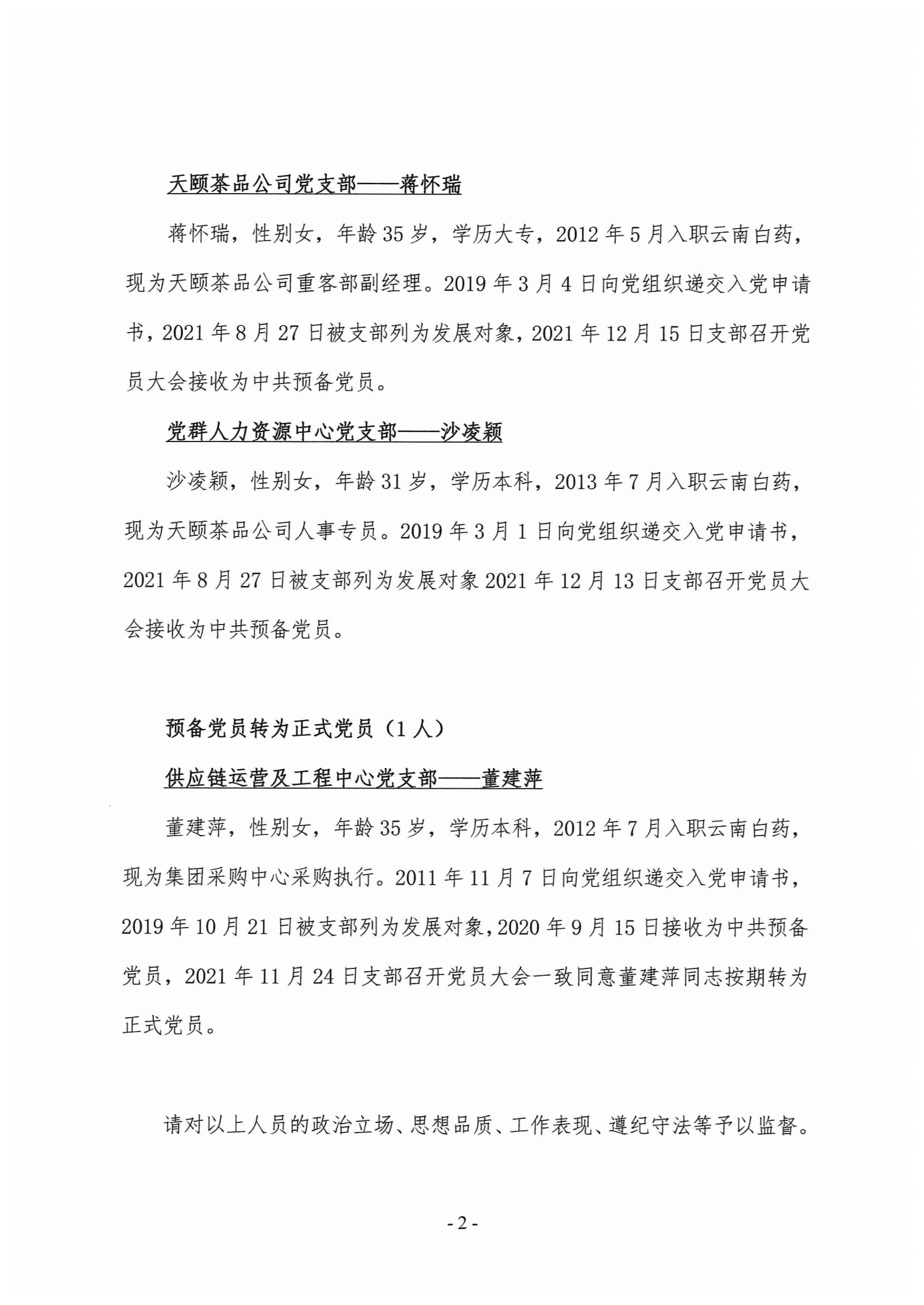 云南白药2021年12月 党员发展情况公示