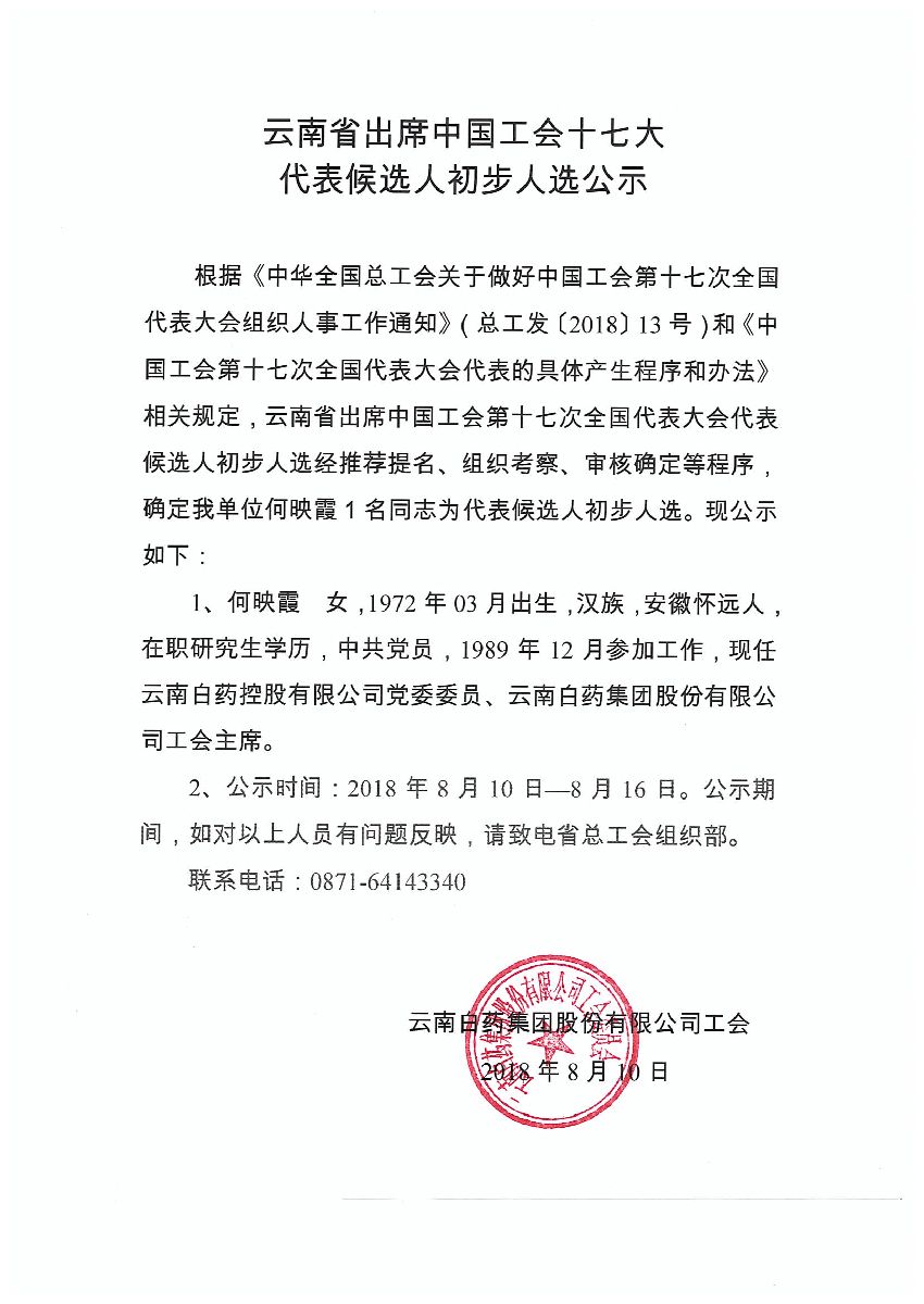 云南省出席中国工会第十七大代表候选人初步人选公示