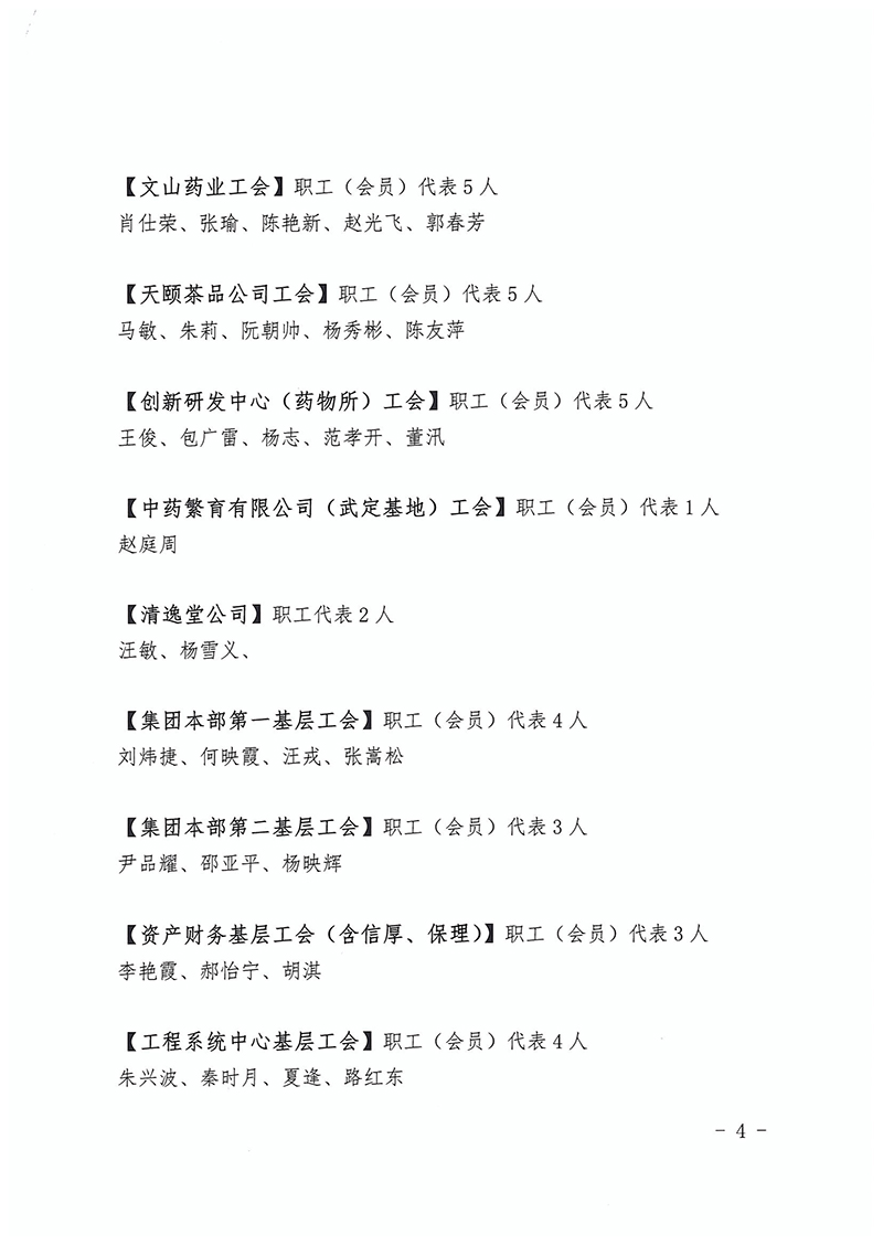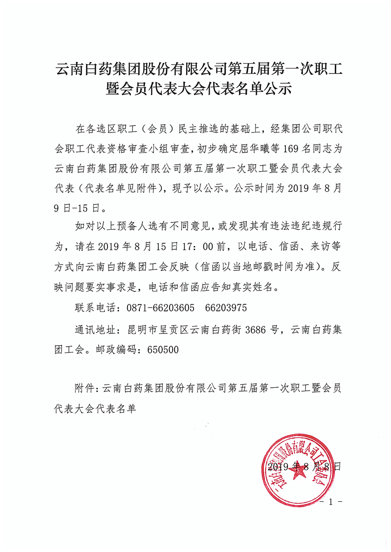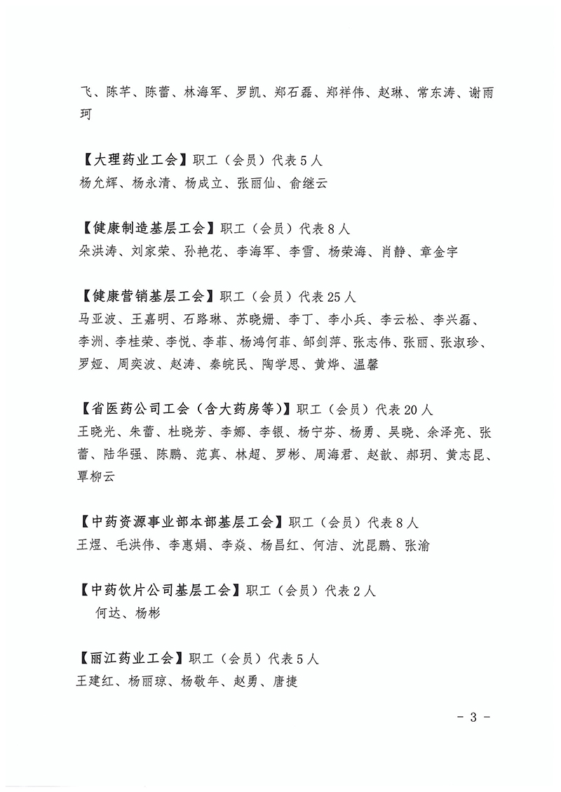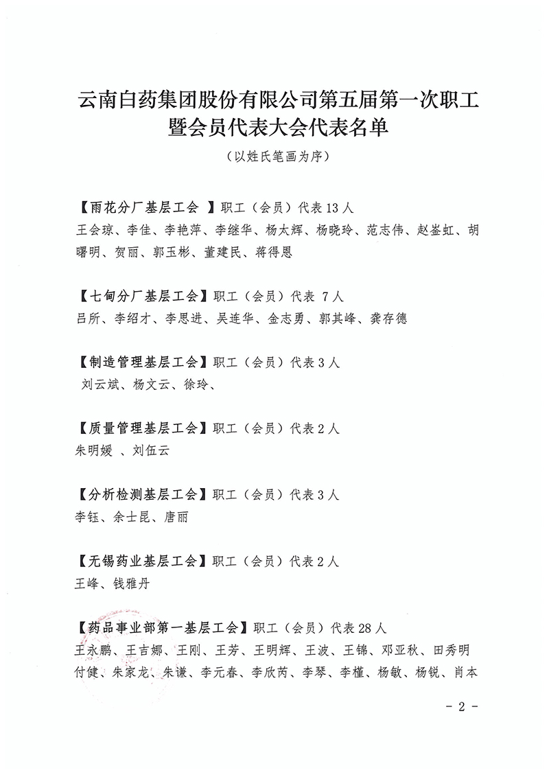 云南白药集团股份有限公司第五届第一次职工暨会员代表大会代表名单公示